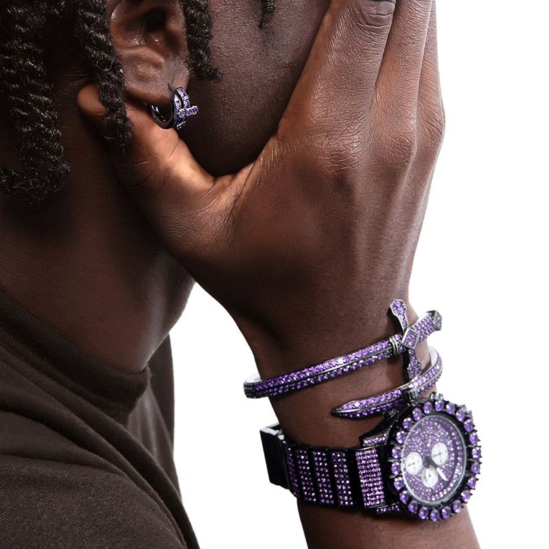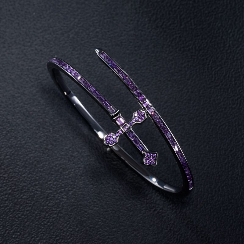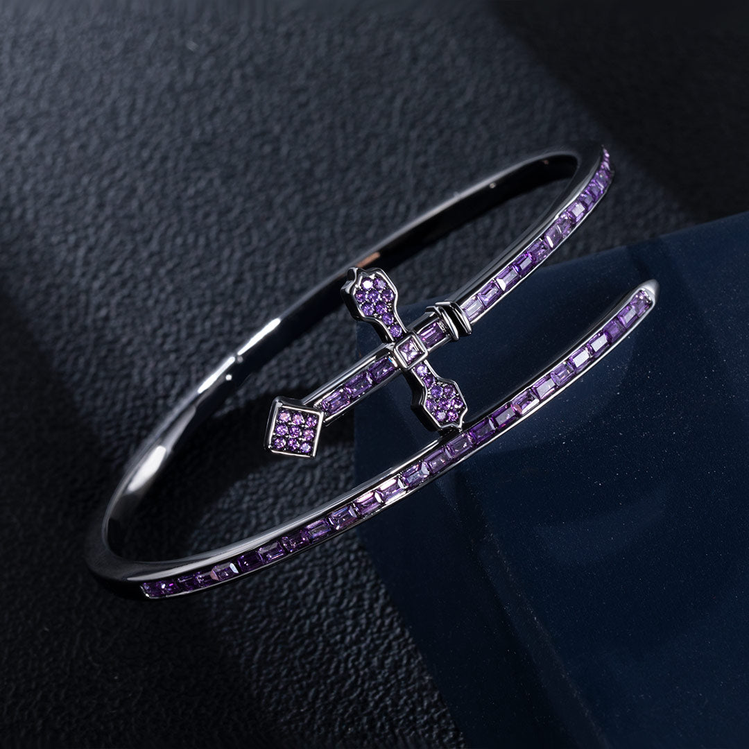 Iced Purple Moissanite Sword Bangle Bracelet in Black Gold