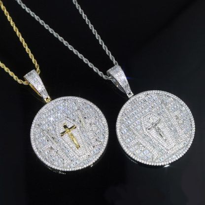 Moissanite Iced Baguette Cut Crucifix Cross Round Pendant