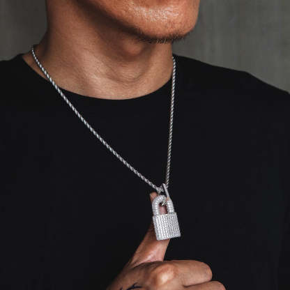 Iced Out Lock Mens Moissanite Pendant Necklace in White Gold