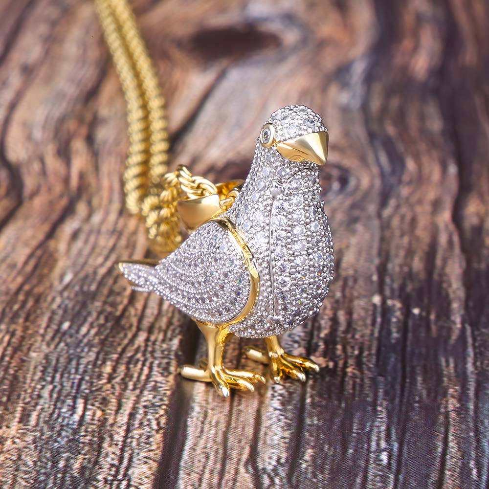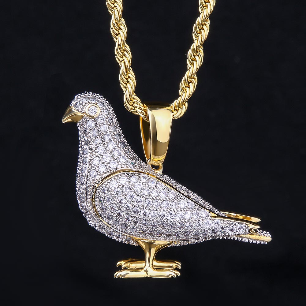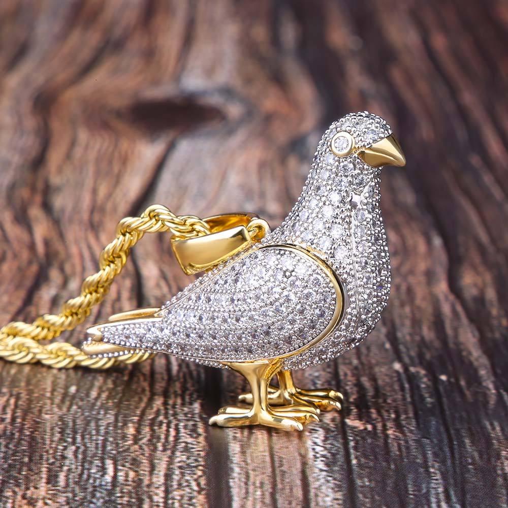 This pigeon pendant is a symbol of freedom and peace. It is considered the carrier of prayers. This iced out pendants features 14k gold plating with bling bling Moissanite stones. The glossy finish makes it super friendly to your wrist skin even though long-time wearing. It can keep bling-bling like brand new at least 2 years following our maintenance rule. VVSBOX insists on creating each jewelry with the best materials and craftsmanship to highlight your shine and cool no matter hanging out with your friends, dancing, in party or styling your own look! This piece of work is so brilliant, only a fanatical jeweler could tell the difference. Get yours today!