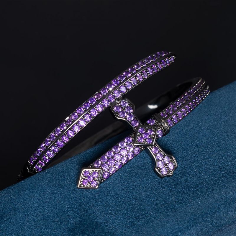 Iced Purple Moissanite Sword Bangle Bracelet in Black Gold