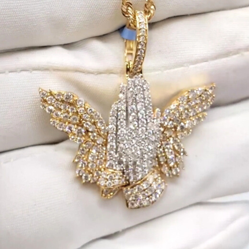 Each pendant features a delicate butterfly design adorned with shimmering Moissante gemstones, renowned for their brilliance and durability. The graceful wings of the butterfly symbolize transformation and growth, while the praying hands at its center evoke a sense of peace and devotion.
