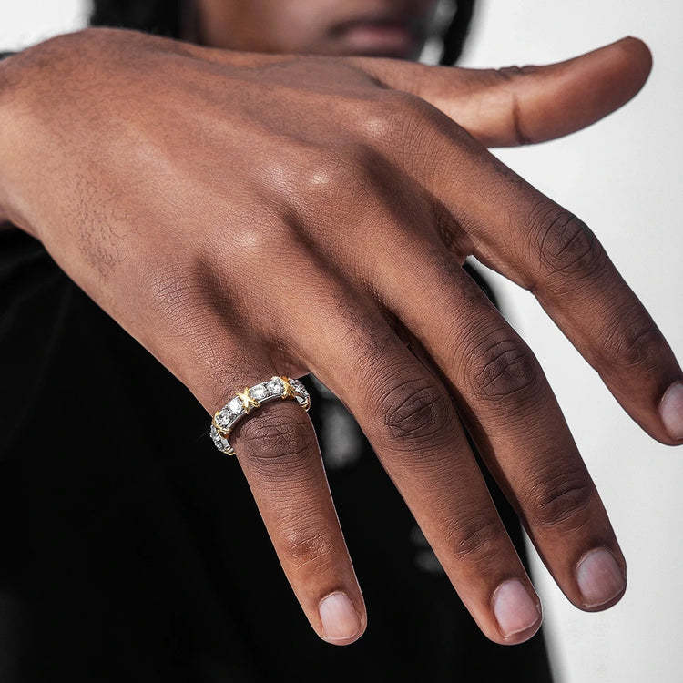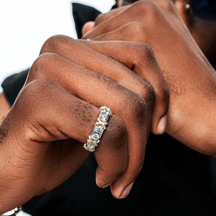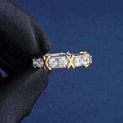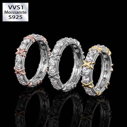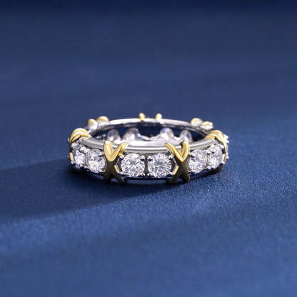 This Crossover Moissanite Ring has a wonderful modern look. Always in fashion in any setting, eternity rings are stackable and are a great accessory for any wardrobe and occasion.